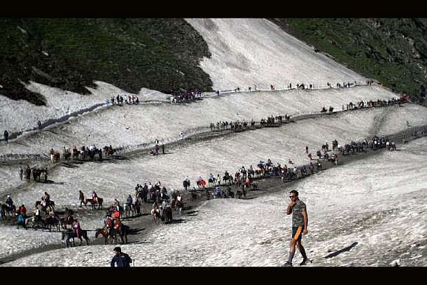 Yatris approach the cave shrine either from the Baltal base camp using the shorter 14-km long uphill trek or from the traditional Pahalgam base camp using the 42-km long uphill trek.