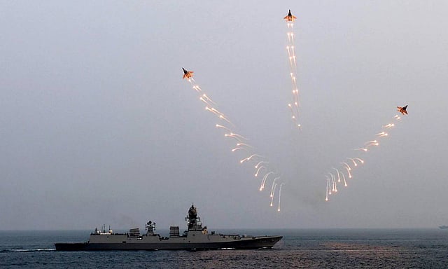 The aircraft that took part in the flypast included Chetak, with flag and naval ensign, MH 60 R, Seaking, Kamov 31, Dornier, P8I, and MiG 29K.