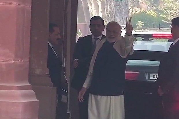 The prime minister showed a victory sign after he arrived in Parliament to attend the winter session.