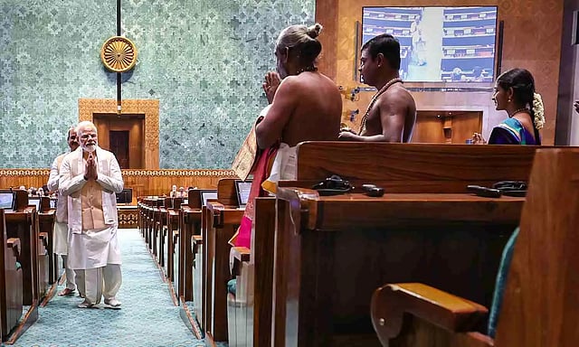 Modi then carried the "Sengol" in a procession amid tunes of "nadaswaram" and chanting of Vedic mantras to the new Parliament building and installed it in a special enclosure on the right side of the Speaker's chair in the Lok Sabha chamber.