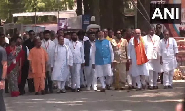 The PM was seen walking with Defence Minister Rajnath Singh and Home Minister Amit Shah, BJP national president JP Nadda, UP CM Yogi Adityanath, and other NDA leaders.