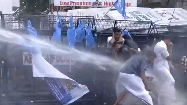 When the protestors moved forward, raising slogans against Chief Minister Pinarayi Vijayan and General Education Minister V Sivankutty, police blocked their path by tying a rope in the middle of the road. As they continued the sloganeering and refused to leave the place, police used water canons twice.