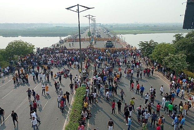 Following the protest, the Delhi Police has put barricades on the Yamuna river bridge, stopping traffic on the DND.
