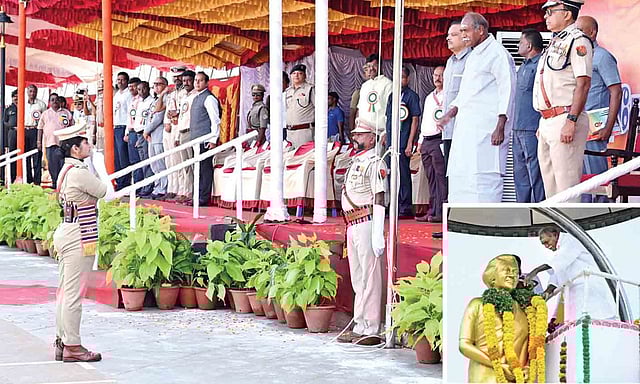 The Chief Minister first inspected a guard of honour presented by the Puducherry police and took the salute at a march past of the police, NCC volunteers, and school children.