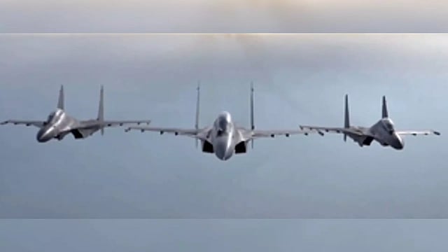 An Indian Navy P-81, flanked by two IAF Su-30 aircraft were flown as the 'Varuna' formation.