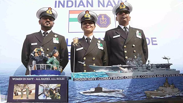 The contingent will be proudly led by Lt Prajwal as Contingent Commander and Lt Mudita Goyal, Lt Sharvani Supreiya & Lt Devika H as Platoon Commanders. The Indian Navy remains steadfast in its commitment to safeguard India's maritime interests. The Indian Navy's tableau for 2024 is a vivid representation of two important and contemporary themes; the first is of Nari Shakti with women in the Indian Navy in all Roles and across all Ranks. The main section of the tableau reflects the second contemporary theme; "Sea Power Across the Oceans Through Indigenisation".