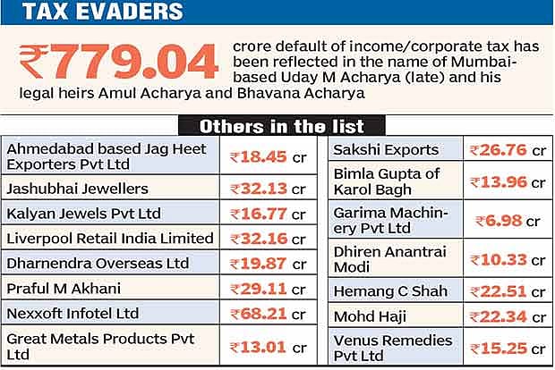 A whopping Rs 779.04 crore default of income/corporate tax has been reflected in the name of one Mumbai-based Uday M Acharya (late) and his legal heirs Amul Acharya and Bhavana Acharya. Others figuring in the latest list include Ahmedabad based Jag Heet Exporters Pvt Ltd (Rs 18.45 crore), Jashubhai Jewellers (Rs 32.13 crore), Kalyan Jewels Pvt Ltd (Rs 16.77 crore), Liverpool Retail India Limited (Rs 32.16 crore), Dharnendra