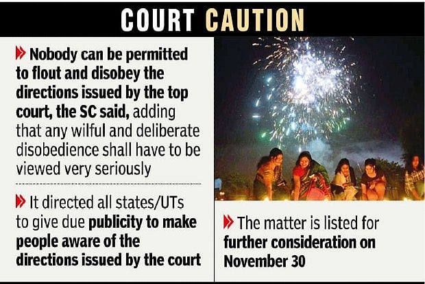 A bench of Justices M R Shah and AS Bopanna said that no authority can be permitted to violate the directions issued by it and allow banned firecrackers in the guise of celebration. Everybody, including the implementing agencies, are bound to see that the directions issued by the courts are implemented and followed in true spirit and in toto, the top court said.