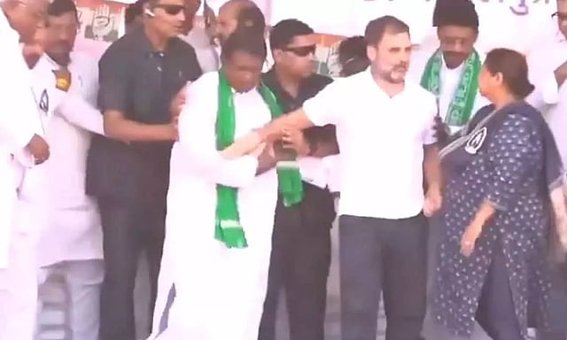 An alert Bharti quickly held Gandhi by the hand, helping him regain his balance and they smilingly told anxious security personnel, who ran to help, that the Congress leader was fine.