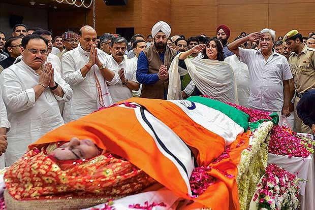 Hundreds of people, including the prime minister, Vice President M Venkaiah Naidu, BJP chief Amit Shah, veteran party leader L K Advani, Delhi Chief Minister Arvind Kejriwal and Assam Chief Minister Sarbananda Sonowal, Union ministers Rajnath Singh Harsh Vardhan and Ashwini Kumar Choubey, BJP working president J P Nadda, and New Delhi MP Meenakshi Lekhi bade her an emotional farewell.