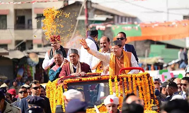 Locals in their thousands, including public representatives, advocates, ex-servicemen and people from across the state extended a hearty welcome to CM Dhami and joined the roadshow as it snaked through Clock Tower Takana, Gupta Tiraha, Kemu Roadways Station on its way to Dev Singh Maidan.