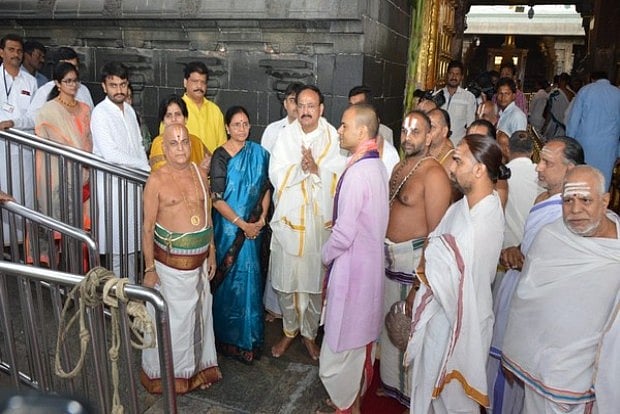 Upon his arrival at the shrine at the crack of dawn, Venkaiah Naidu, an ardent devotee, was accorded a warm reception and was conducted to the sanctum sanctorum by TTD Executive Officer KS Jawahar Reddy and other top officials, a temple official told P T I.