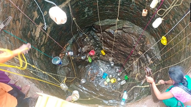 MELGHAT (Maharashtra): A group of villagers in Maharashtra's Khadial village hurling their plastic and metal cans, buckets and bottles strung with ropes down a deep well to fetch water is now a common sight.