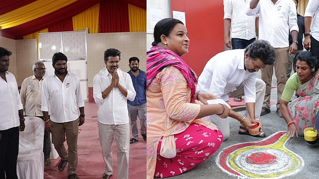 During the visit, he interacted with local voters and listened to their grievances. Responding to a request from women in the area, Vijay also drew a whistle kolam at the entrance of the office.