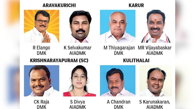 The DMK, for its part, had already decided to contest all four constituencies, fielding Asi M Thiyagarajan (Karur), Sooriyanur A Chandran (Kulithalai), R Elango (Aravakurichi) and CK Raja (Krishnarayapuram–SC).