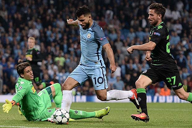 The game had been carried over from Tuesday due to a thunderstorm and Aguero made up for lost time with his second treble of the campaign after his hat-trick against Steaua Bucharest in the play-off round.