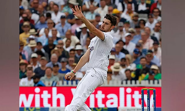 Josh Tongue gets the wicket of Usman Khawaja, cleaning up his stumps to give England a breakthrough.