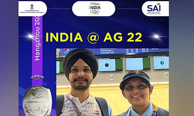 "India's 8th SiLVER in Shooting Hats off to our stellar duo, #KheloIndiAthlete@Sarabjotsingh30 Singh and #TOPSchemeAthlete Divya who secured Silver in the 10m Air Pistol Mixed Team event at #AsianGames2022. Their remarkable performance adds another feather to India's glorious tally of 34 medals, with 19 in shooting. Superb!! #Cheer4India #Hallabol #JeetegaBharat #BharatatAG22," tweeted SAI Media.