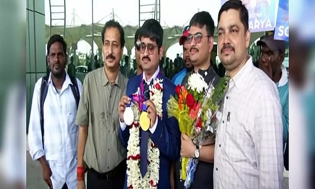 BHUBANESHWAR: Indian para chess player Soundarya Kumar Pradhan, who bagged two medals at the 4th Asian Para Games in Hangzhou, China received a warm welcome at Bhubaneswar airport on Friday.