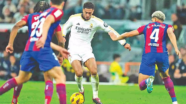 MADRID: LaLiga leader Real Madrid’s pursuit of a record-extending 36th Spanish title gathered momentum after Jude Bellingham scored a goal in added time to secure a 3-2 comeback win over Barcelona on Sunday.