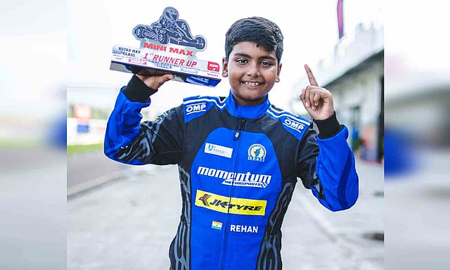 At just 12 years old, Rehan has already made waves in Indian karting. Competing in the Mini Max class, he holds the fastest lap records at all three FMSCI-homologated circuits in the country — the MIKA Circuit in Chennai, the Coast Circuit in Coimbatore, and MECO Kartopia in Bengaluru.
