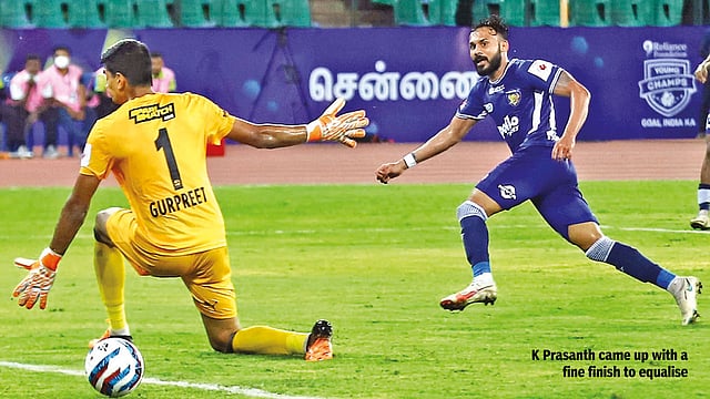 After going behind, CFC stepped on the gas and had four clear-cut opportunities before it eventually drew parity. In the 15th minute, right-back Ajith Kumar laid the ball off to Prasanth, only for the winger to hit it straight at BFC custodian Gurpreet Singh Sandhu with a left-footed effort. About five minutes later, central defender Fallou Diagne’s headed connection off a Narayan Das corner-kick went wide by a whisker.