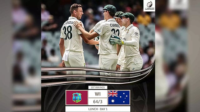 ADELAIDE: Pat Cummins and Josh Hazlewood help Australia to dominate over West Indies at lunch break on day one of the first Test match in Adelaide.