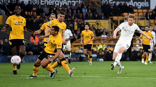 WOLVERHAMPTON: Midfield maestro Kevin De Bruyne scored four goals as Manchester City notched up a 5-1 victory at Wolverhampton Wanderers (Wolves) on Wednesday, a win which put the Belgian’s team in a commanding position to retain the English Premier League crown.