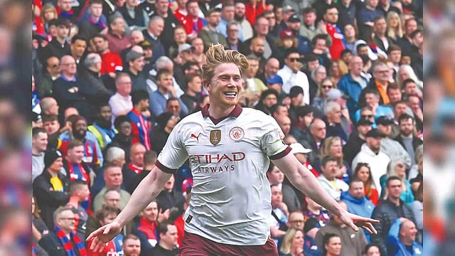 LONDON: Kevin de Bruyne struck twice to inspire Manchester City to a dominant 4-2 win at Crystal Palace on Saturday and move the champions level on points with Liverpool at the top of the Premier League table.