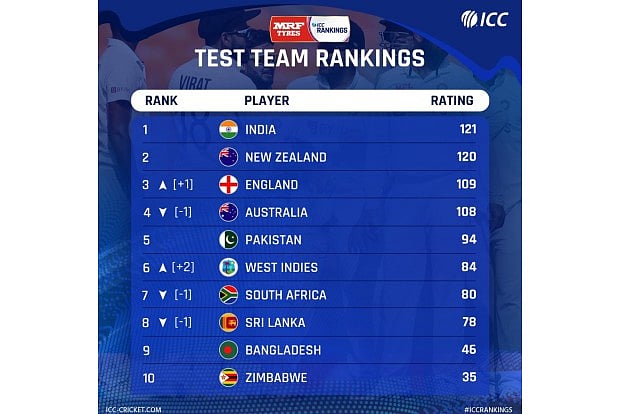 England overtook Australia to take third place with 109 rating points. Australia currently have 108. The West Indies, who beat Bangladesh 2-0 and drew 0-0 with Sri Lanka in series played this year, have moved from eighth to sixth with 84 points, their best position since 2013.