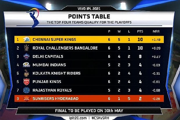 With 10 points from six games, CSK are level on points with second-placed Royal Challengers Bangalore (RCB) and lead third-placed Delhi Capitals by two points. They, however, have a far superior net run rate (NRR) than RCB. MS Dhoni's team boast an NRR of +1.475, the best in the league, while Virat Kohli's side are on +0.089.