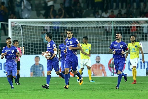 Messi Bouli, who led the Kerala attack in the absence of Bartholomew Ogbeche, was a handful for the home defence. Midway through the half, the Cameroonian striker pulled off a brilliant overhead effort from inside the box off Jessel Carneiro’s cross, but was denied a goal-of-the-season contender by Amrinder.