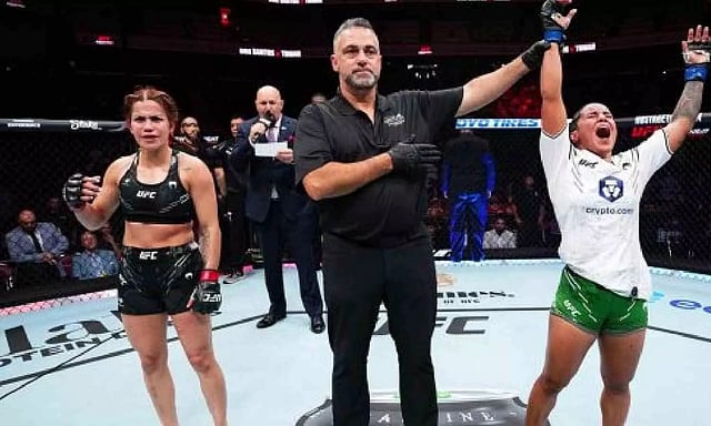 Tomar who hails from Uttar Pradesh, faced Rayanne dos Santos at strawweight in the very first bout of the card. Tomar and dos Santos went all three rounds: 15 minutes of gruelling, fast-paced back-and-forth action. Santos used her height advantage and range to dictate the action, but Tomar went kicking and screaming to the final bell, causing damage in the process. When the scorecards were read, Tomar picked up a split decision win (30-27, 27-30, 29-28).