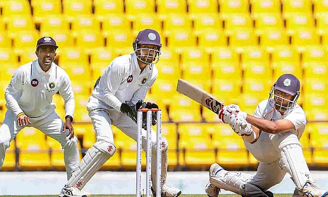 Kerala 1st innings: 298 for 6 in 99 overs (Aditya Sarwate 79, Sachin Baby 82 batting, Mohammed Azharuddeen 34; Darshan Nalkande 3/52, Harsh Dubey 2/72).