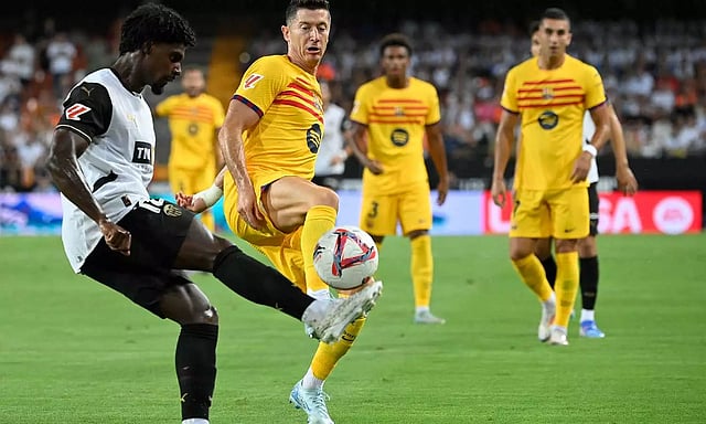 Valencia opened the scoring with a header by Hugo Duro in the 44th, but Barcelona rallied with goals by Lewandowski in first-half stoppage time and four minutes into the second half.