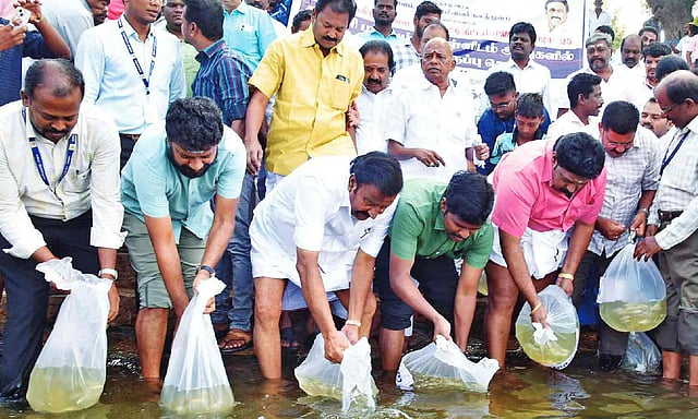 At an event organised by the Tamil Nadu fisheries department, as part of the Prime Minister Matsya Sampada Yojana, which aims to promote the livelihood of fishermen, minister KN Nehru released 4.50 lakh fingerlings into the Cauvery and Kollidam into upper Anicut. Fish species like common carp, rohu, catla, tilapia and red-carp were released.