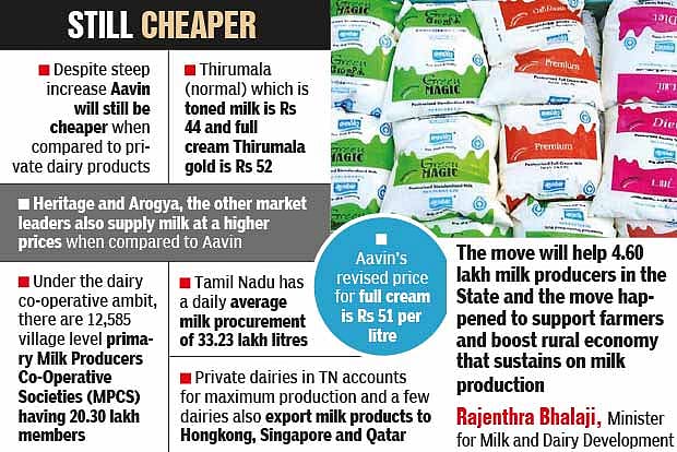 Meanwhile, AMMK leader TTV Dhinakaran condemned the steep rise in milk price. In a tweet on Saturday he demanded immediate roll back of Aavin milk price and advised cost effective regulation for milk co operatives societies to control the input costs for milk.
