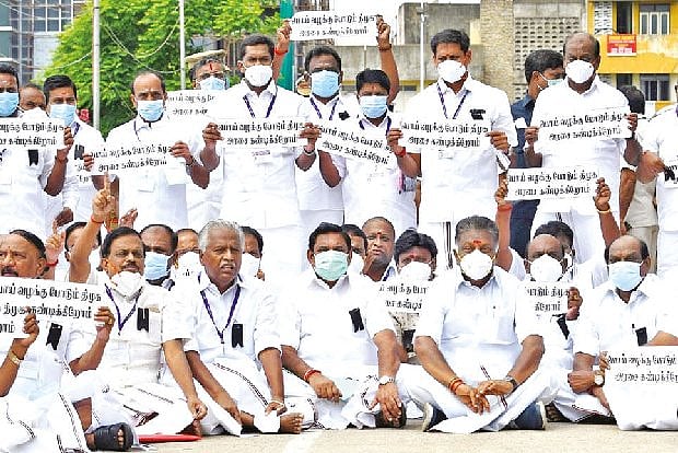 As soon as the debate on Budget session commenced, Palaniswami rose and tried to speak on Kodanad issue. As he did not obtain prior permission, he was not allowed to raise the issue and his comments were expunged. Opposing this, AIADMK MLAs walked out of the Assembly shouting slogans against the government. They held placards and raised slogans in the veranda, but Speaker M Appavu asked the guards to remove them from veranda. Miffed the Opposition members came out of Kalaivanar Arangam and staged a dharna.