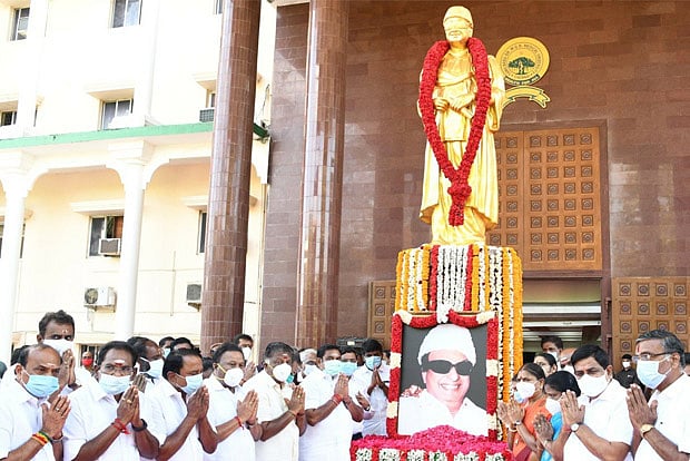 Makkal Needhi Maiam chief Kamal Haasan, who latched on to the late leader's welfare legacy in his ongoing poll propaganda and Amma Makkal Munnetra Kazhagam general secretary TTV Dhinakaran among the others paid floral tributes to a statue of the leader here.