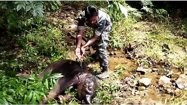 Estate workers spotted the calf lying near a waterfall on the side of a road leading to Glenrock Coffee Estate in Pandalur Range. On receiving information, the forest department staff arrived and woke up the calf and helped it drink water from a nearby stream.