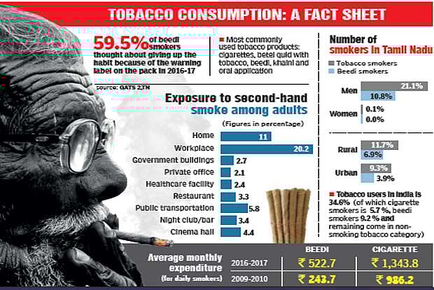 Currently in Tamil Nadu, about 10.8 per cent of men smoke the beedi, and hardly any women are into the habit. Of this, 6.9 per cent are from rural areas and 3.9 per cent from urban areas.
