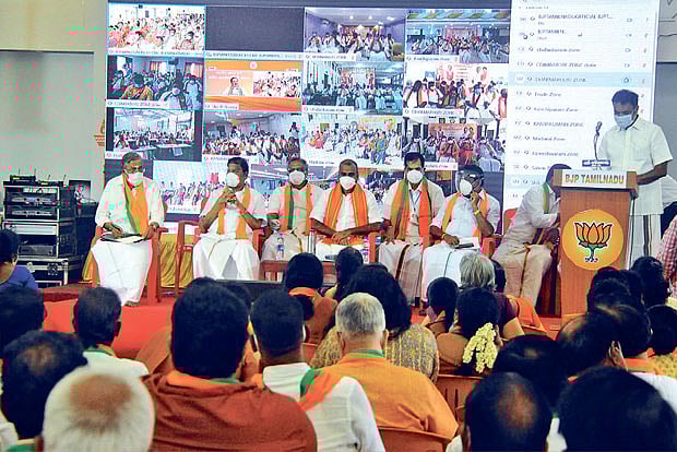Muralidhar Rao took part in the virtual meeting from Delhi. state BJP president L Murugan, former union minister Pon Radhakrishnan, national secretary H Raja and senior leaders welcomed Nadda from Chennai.