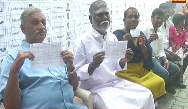 Similarly, DMDK candidate S Anand, who came to cast his vote with a party towel on his shoulders, was asked by election officials to remove before exercising his democratic rights at a polling booth in Agraharam.