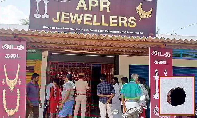 On Monday morning, G Karthick found jewels missing and was shocked to find a huge hole in the rear side wall of the shop.