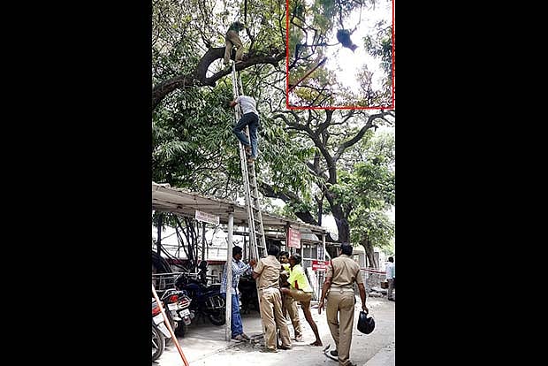 They found that it was clinging to one of the weak branches on the top of the tree and was not able to wriggle out. Its distress increased by the minute. As they were unable to help it, the people in the neighbourhood realised that it could not go hungry for long and they came together to rescue the animal. They informed the fire and rescue personnel who swung into action immediately.
