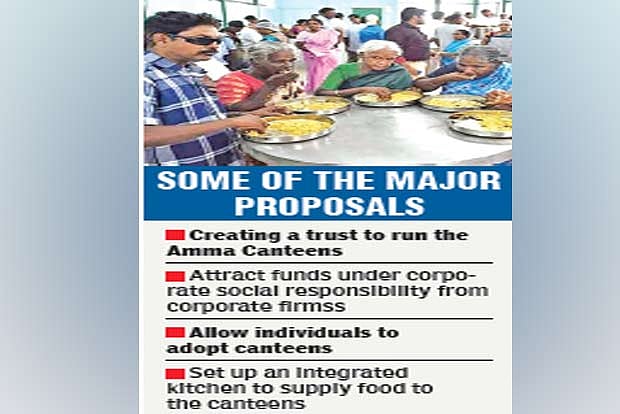 Chennai Corporation’s proposals, include creating a trust to run the Amma Canteens or to attract funds under corporate social responsibility from corporate firms. Other proposals are allowing individuals to adopt canteens or to set up an integrated kitchen to supply food to the canteens.