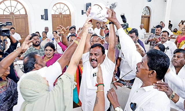 In response, the DMK and alliance councillors raised counter slogans, resulting in noisy scenes. The DMK councillors snatched the placards from the AIADMK councillors and tore them away. Amid the uproar, the two AIADMK councillors walked out of the meeting hall, while continuing their protest outside the venue.