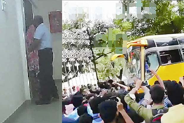 The footage, shared widely on WhatsApp and Facebook, triggered tension among the college students who later resorted to violence and vandalism by hurling stones and smashing several window panes at the institution. Angered over the act, several members of the Students Federation of India (SFI) blocked the road in front of the college in the afternoon and were soon joined by more than 300 students of the college, who shouted slogans demanding stern action against the chairman.