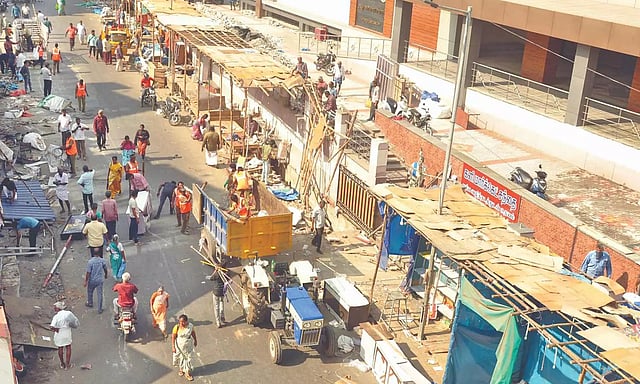 The crackdown triggered a protest by traders, who also broke into an argument with authorities. As the long stretch of the road from Panneerselvam Park to Clock Tower got narrowed down by encroachments, vehicle snarls became frequent.