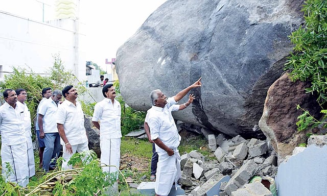 Over the last few days, unprecedented rains led to a huge boulder rolling down the hills into Thambusamy Nagar in Venkatapuram Panchayat around 4 am. A major tragedy was averted as the boulder came to a halt after breaking the compound wall of the house of Venkatachalam, an AIADMK functionary.